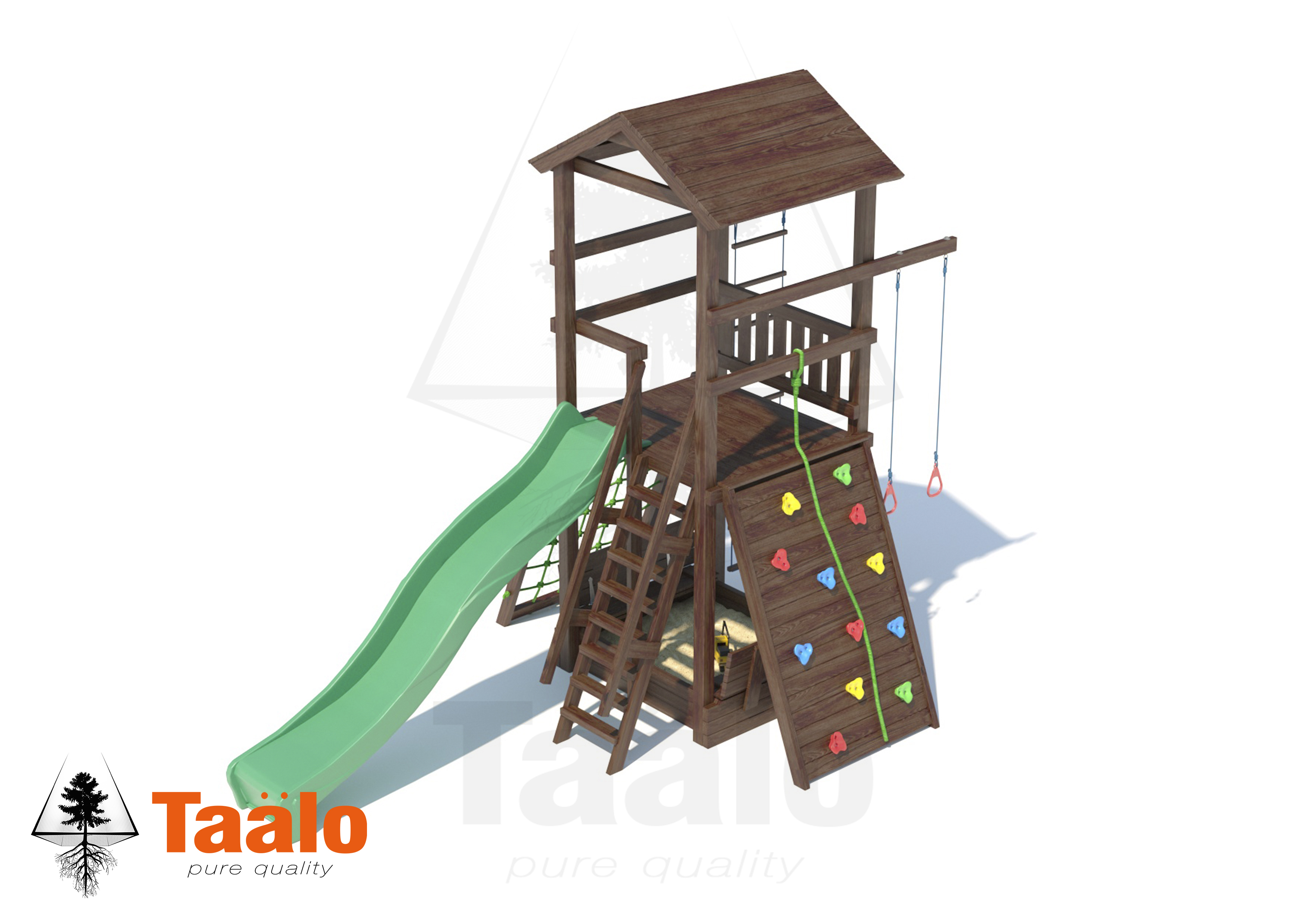 Серия комплексов TAALO– это уникальные по своим характеристикам игровые площадки, производятся полностью из сибирской лиственницы, что гарантирует вам безопасное экологичное и длительное использование конструкции в любое время года. Каждая деревянная деталь обработана покрытием в два слоя – антисептической восковой лазурью «ADLER» цвет «орех», с торцов дополнительно запечатана мастикой. Пропитка нетоксична и имеет прекрасные водо- и грязеотталкивающие свойства, а также придает глянцевый блеск дереву, не закупоривая поры.