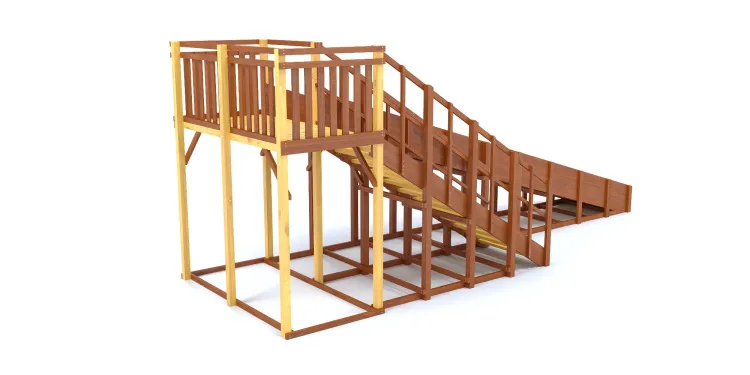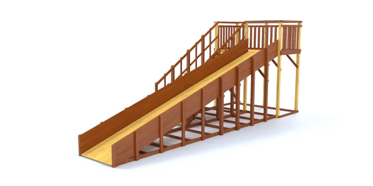 Изделие выполнено из древесины, стойкой к снегу, дождям, морозу, и соответствует ГОСТам 52169-2012 и 9885-95. Для несущих и нагруженных деталей, опор использован брус 90х90 мм. Для экономии места на площадке лестница расположена параллельно спуску.
