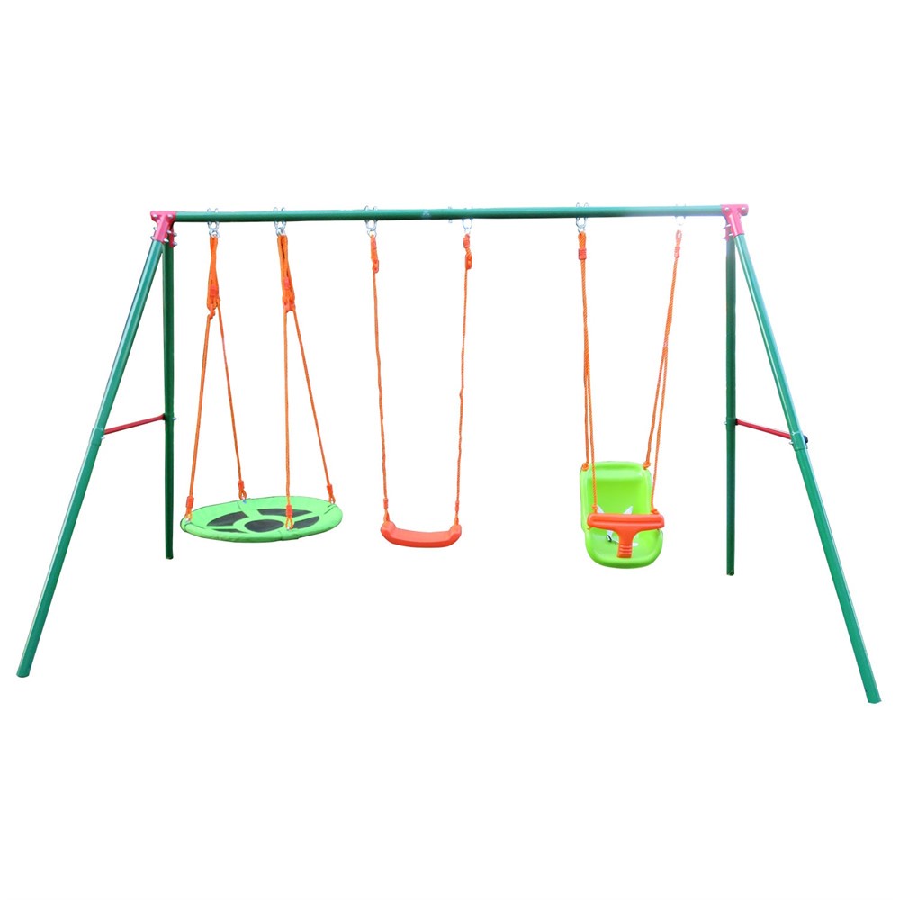 Комплекс включает в себя: веревочные качели (без спинки), качели - гнездо и качели для малышей.