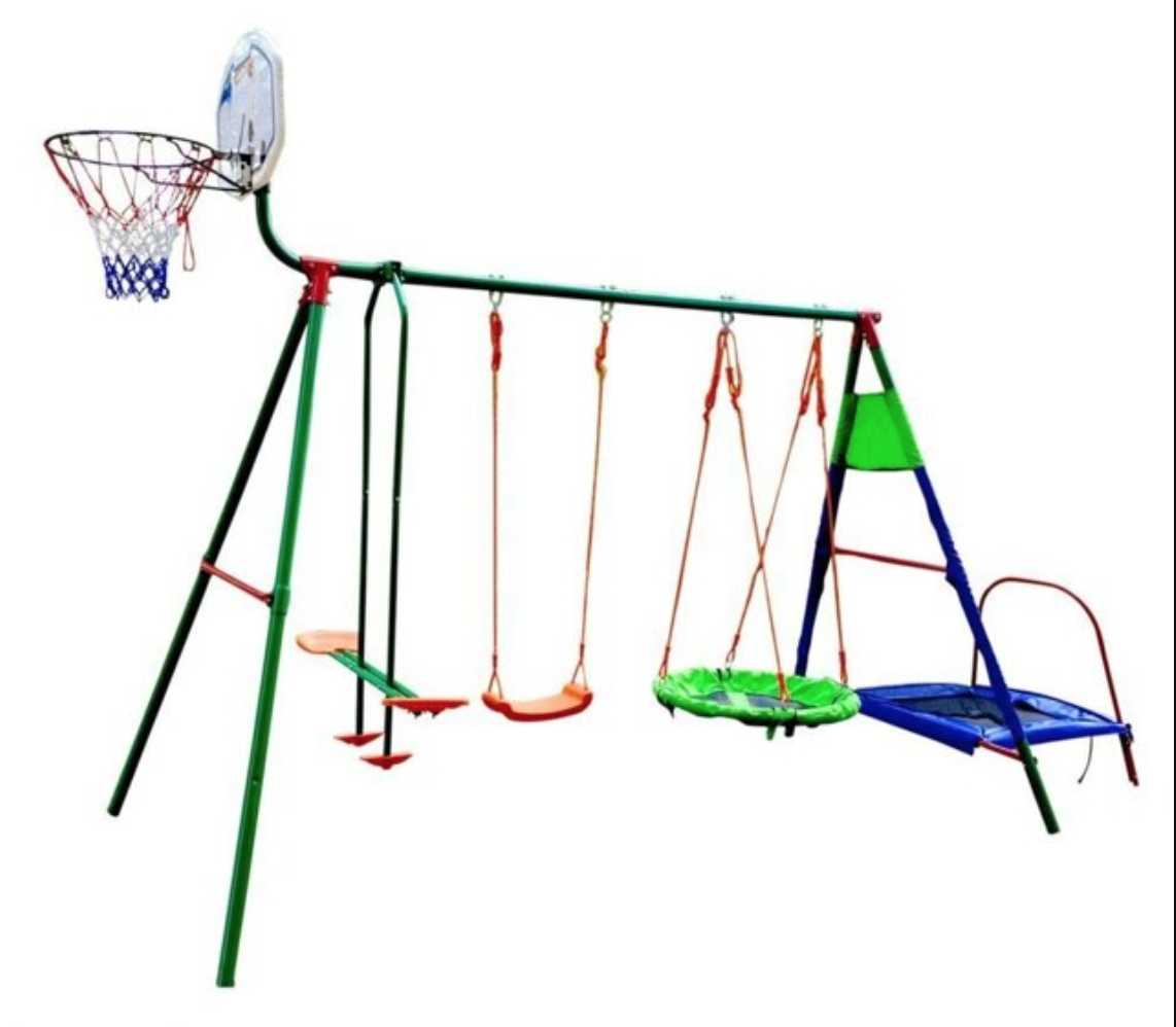 В комплекте: верёвочные качели, качели-качалки для двоих, качели-гнездо, мини-батут и кольцо для баскетбола (R18").