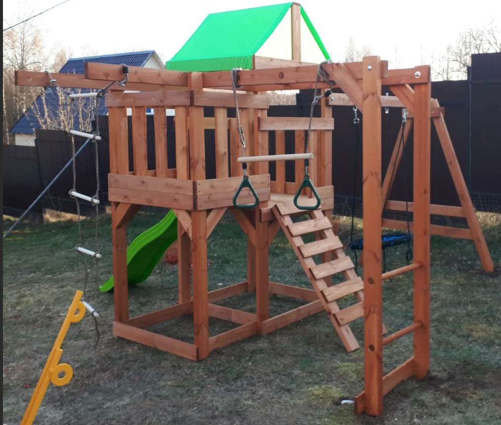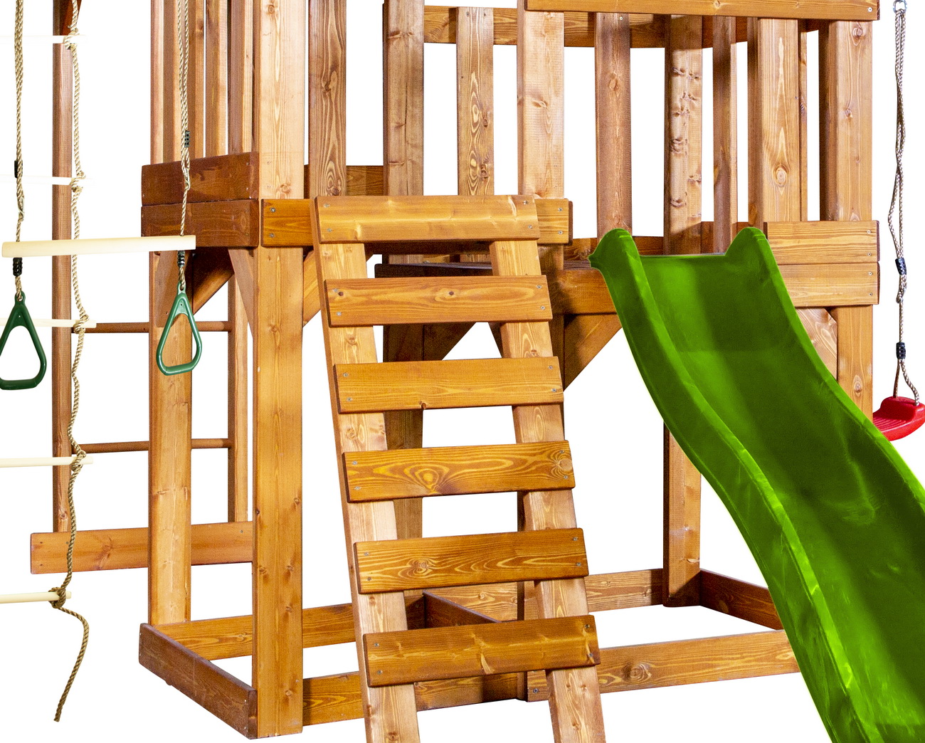 Конструкция имеет эргономичную форму и не травмоопасная, что особенно важно для малышей. Игровая площадка изготовлена из хвойной древесины северных пород, обработана гипоаллергенным покрытием на водной основе (не содержит токсичных растворителей). Навесное и игровое оборудование сделано из экологически безопасного пластика, металлические элементы из высокопрочной оцинкованной стали.