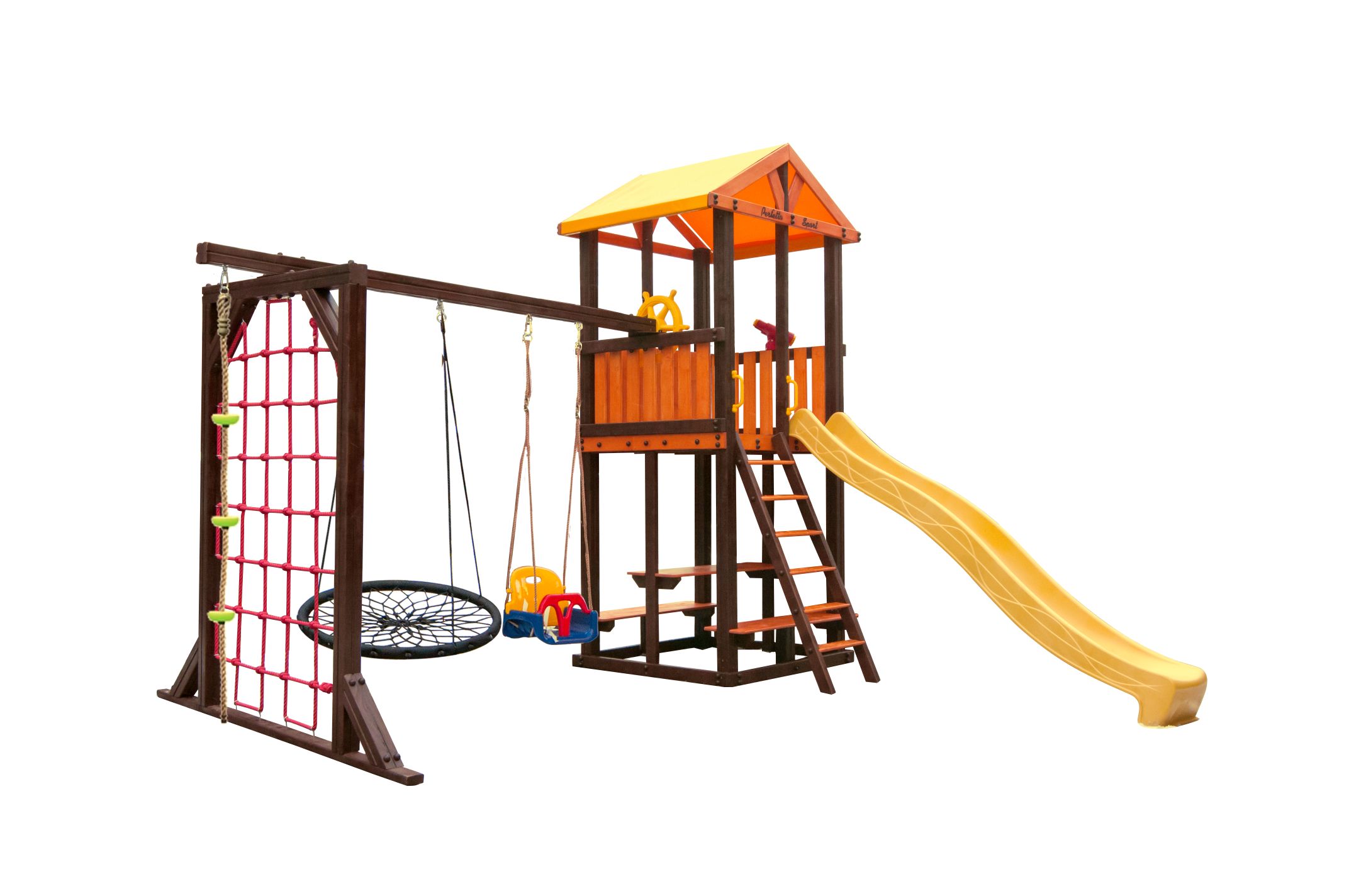 - Комплектация: игровой домик, столик, лавочка - 2 шт, лестница, скат, ручка пластиковая - 2 шт, П-опция, качели "Лодочка", качели "Малыш", канат с зацепами, штурвал "Шторм", бинокль "Капитан", качели "Паутина"