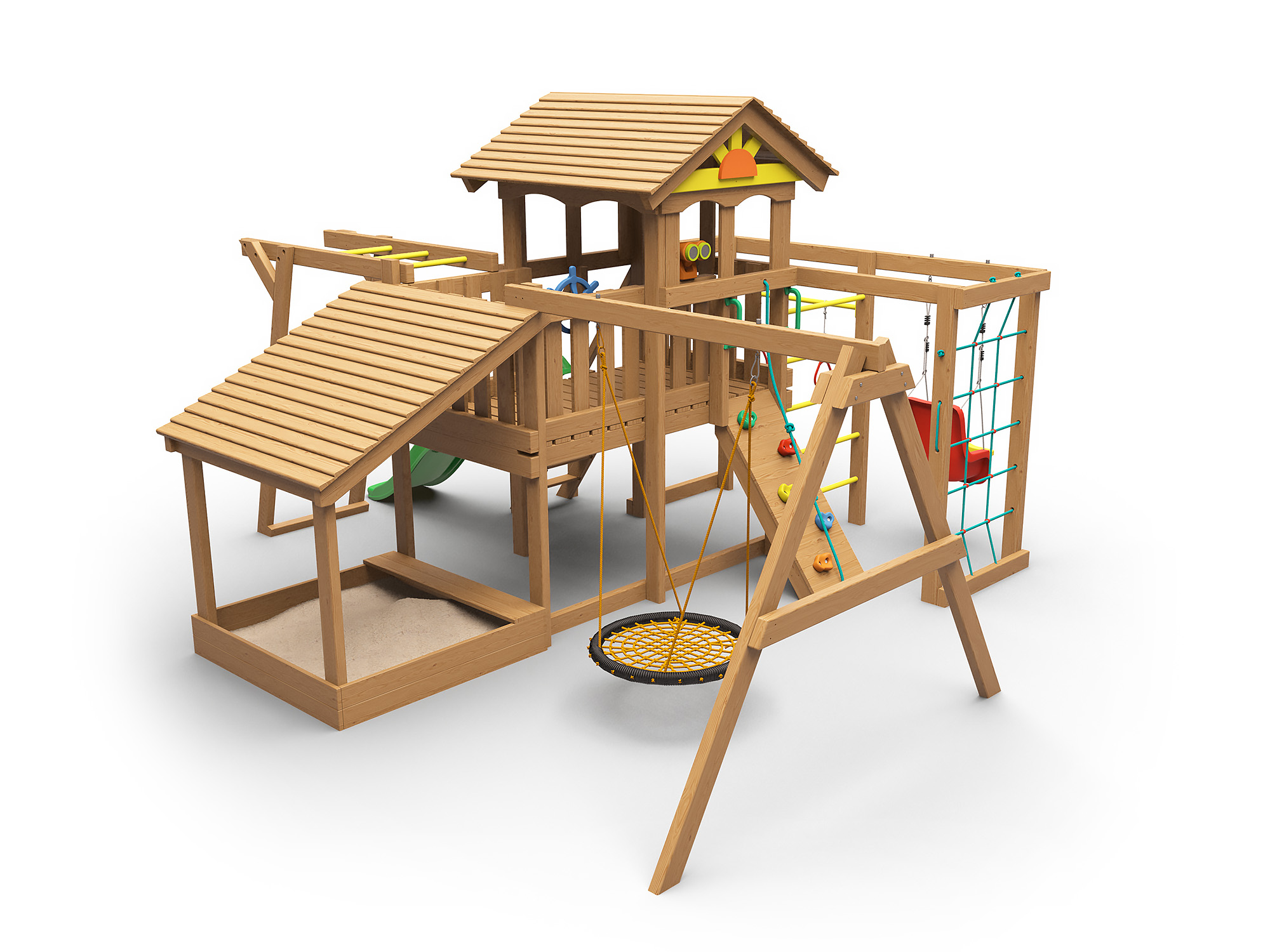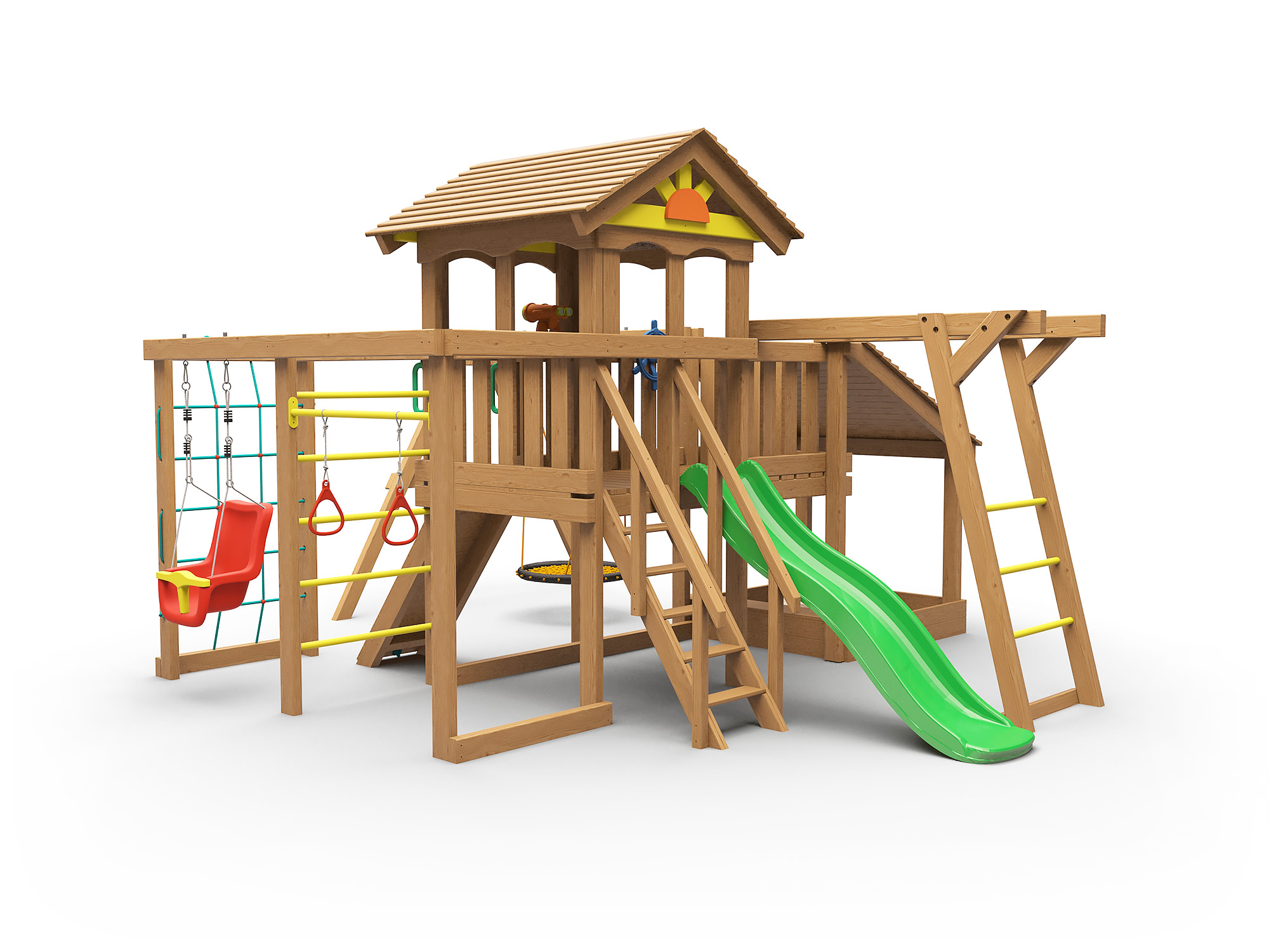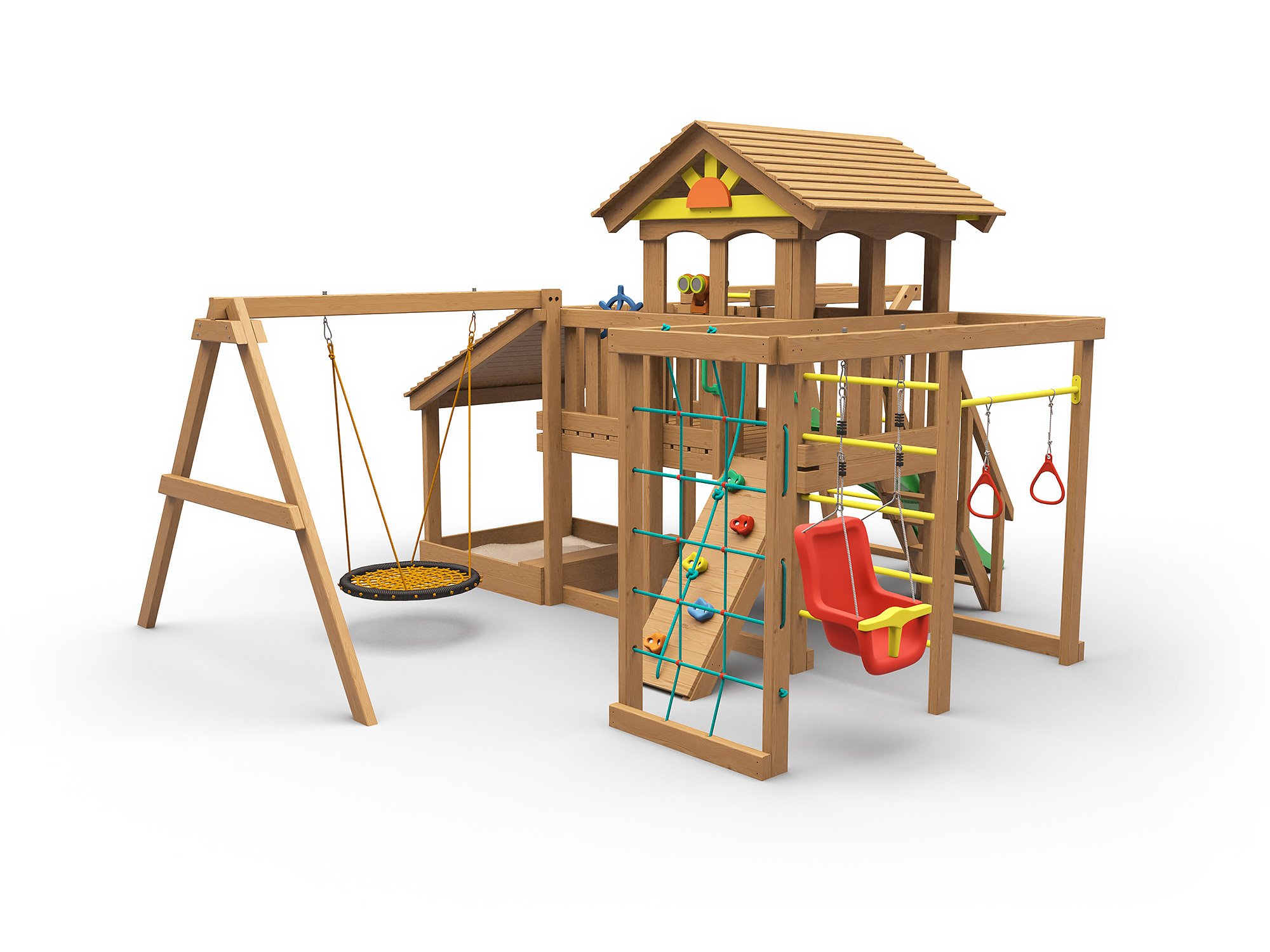 Комплекс оснащен всем необходимым для активной и увлекательной игры малышей от 1 года до 7 лет. Горка, два вида качелей, в том числе любимое гнездо, скалодром, рукоход, турник, кольца-все это и много другое порадует маленьких непосед. Конструкция сделана в соответсвии с ГОСТ и будет достойным образом служить долгие годы и радовать взыскательных и требовательных родителей.