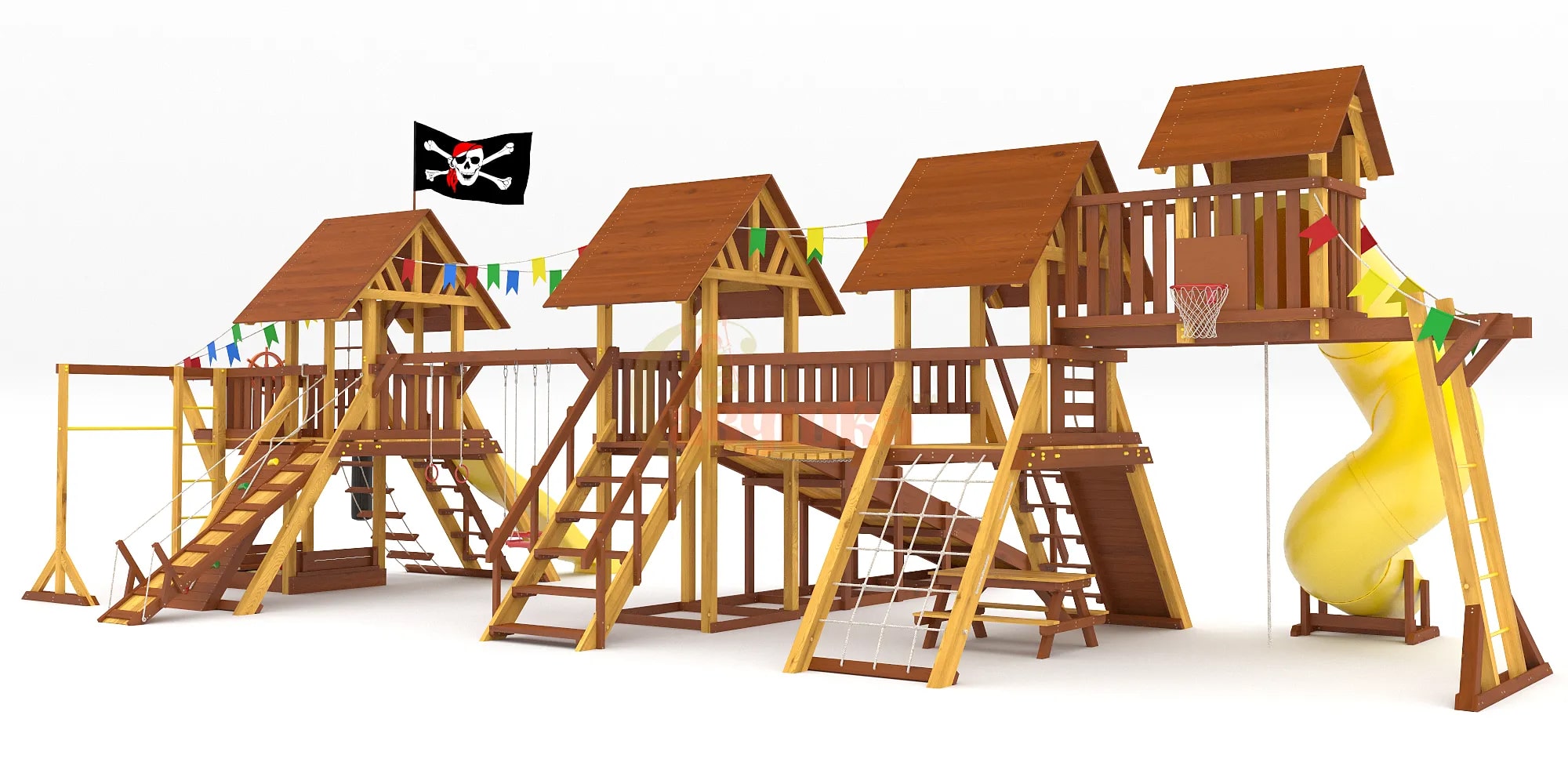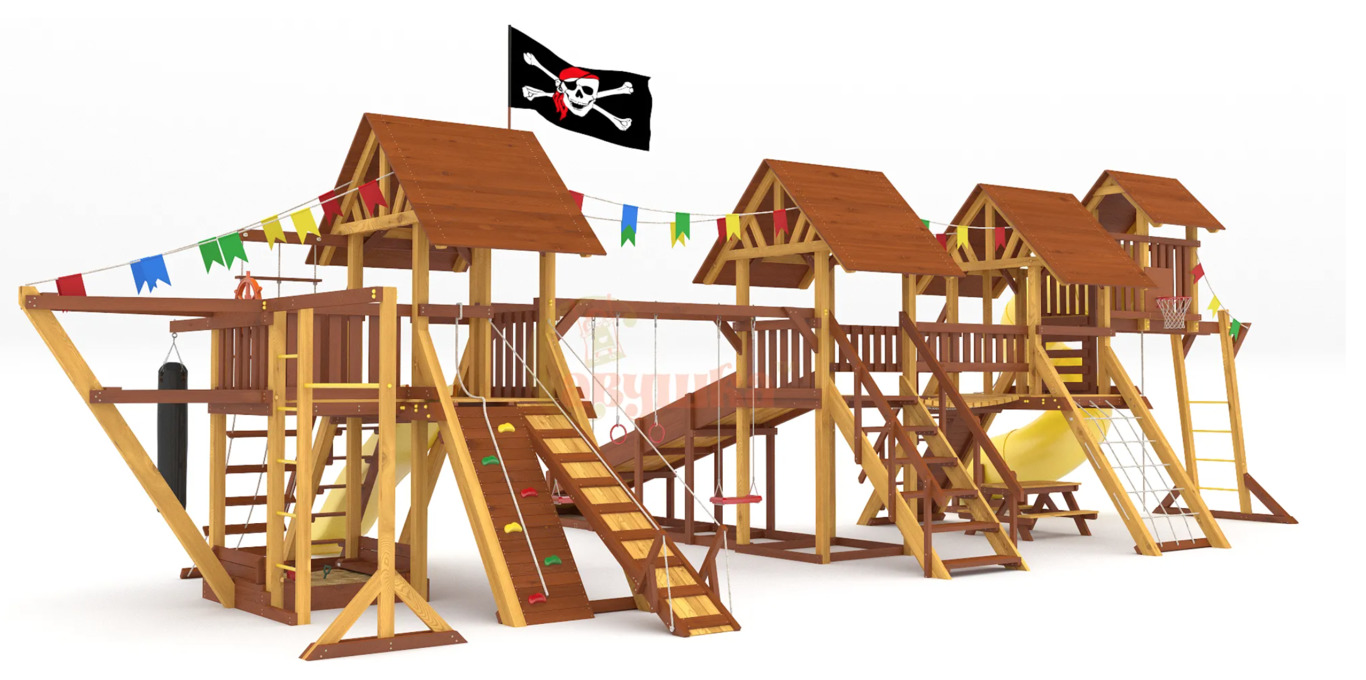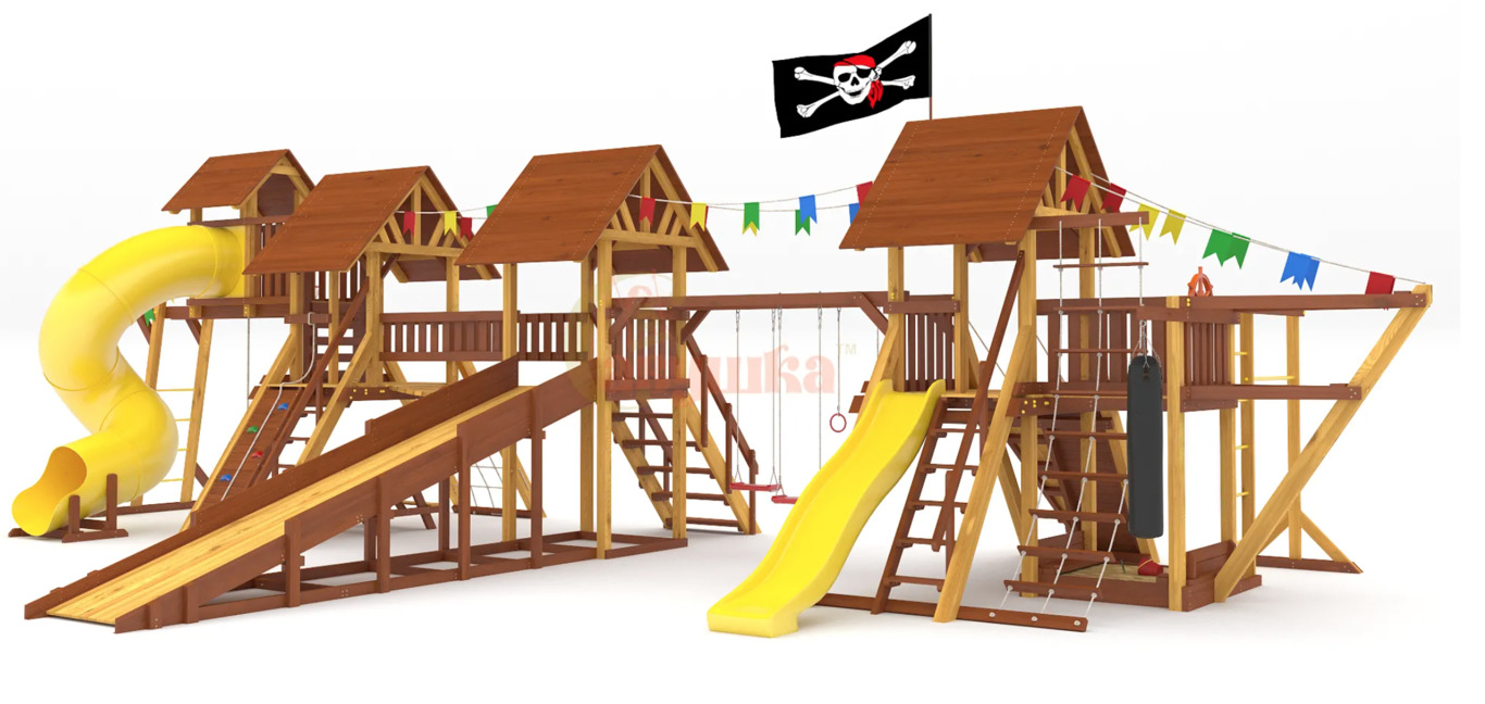 По подвесному мостику можно попасть на другое "судно" - малую игровую башню. Там есть небольшая пластиковая горка и пиратский флаг. Снова поднявшись на большую башню Люкс, малыш непременно захочет скатиться с крутой винтовой горки в виде трубы. Настоящий аттракцион!
