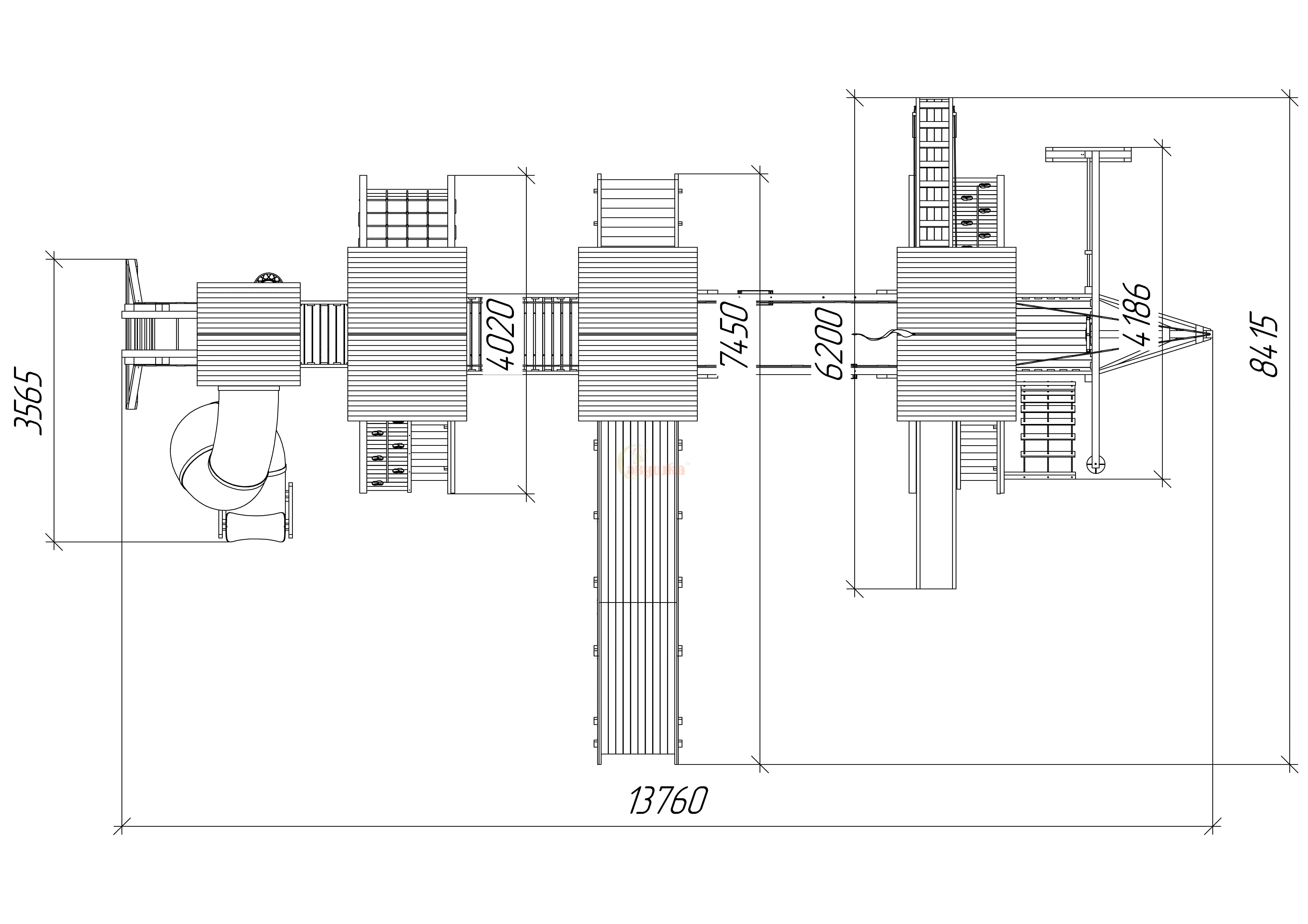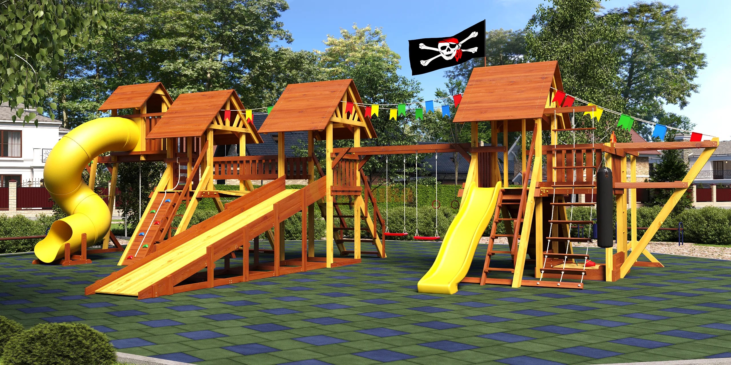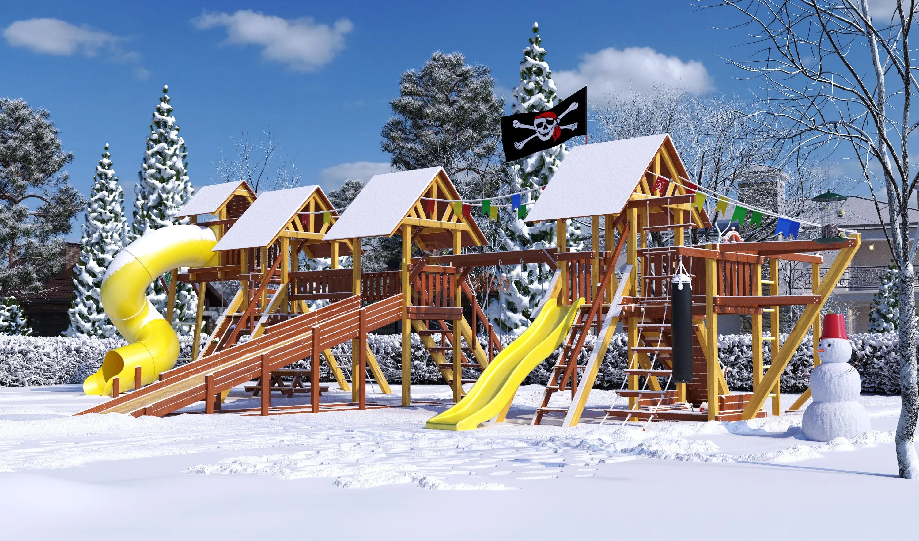 По подвесному мостику можно попасть на другое "судно" - малую игровую башню. Там есть небольшая пластиковая горка и пиратский флаг. Снова поднявшись на большую башню Люкс, малыш непременно захочет скатиться с крутой винтовой горки в виде трубы. Настоящий аттракцион!