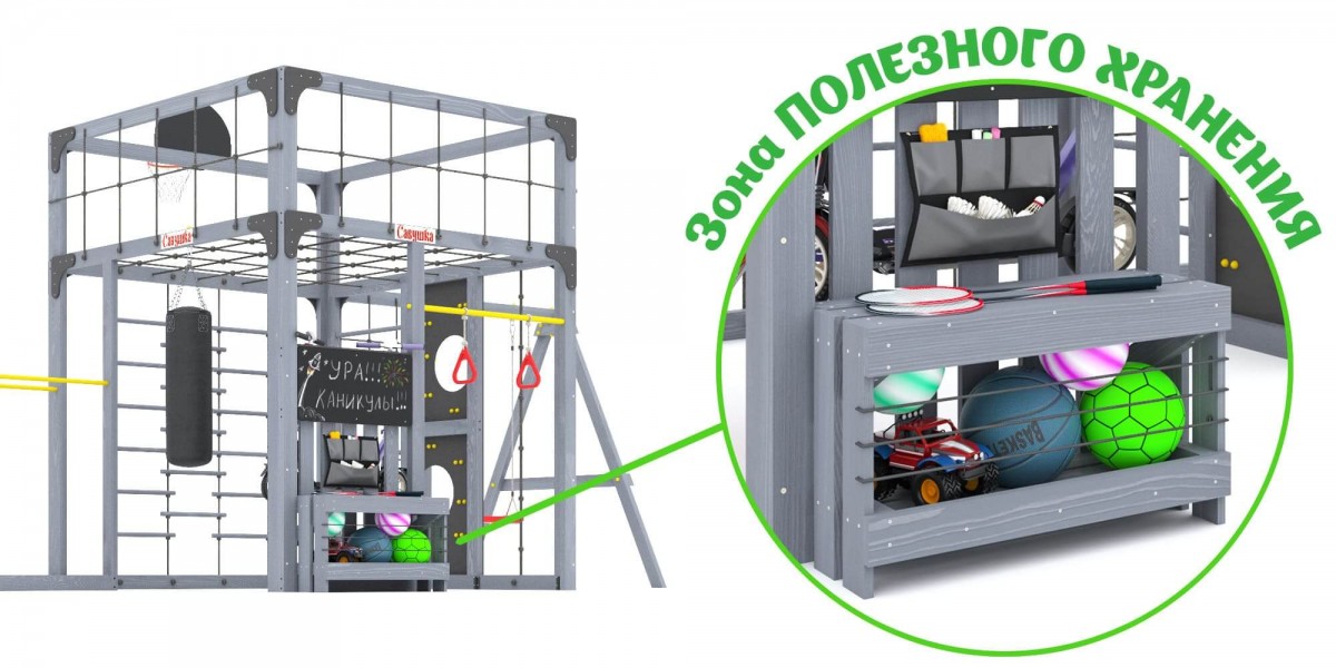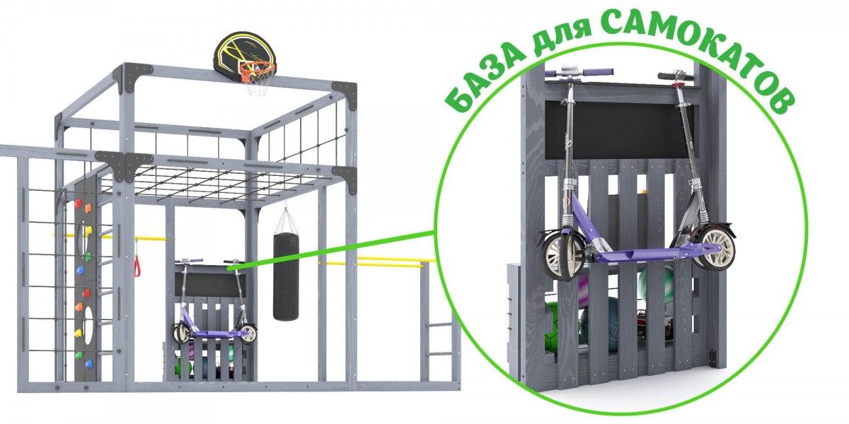 - База для самокатов (на 2 штуки), органайзер и ящик-скамья с резинкой для мячей — всё на своих местах, и ничего не потеряется.