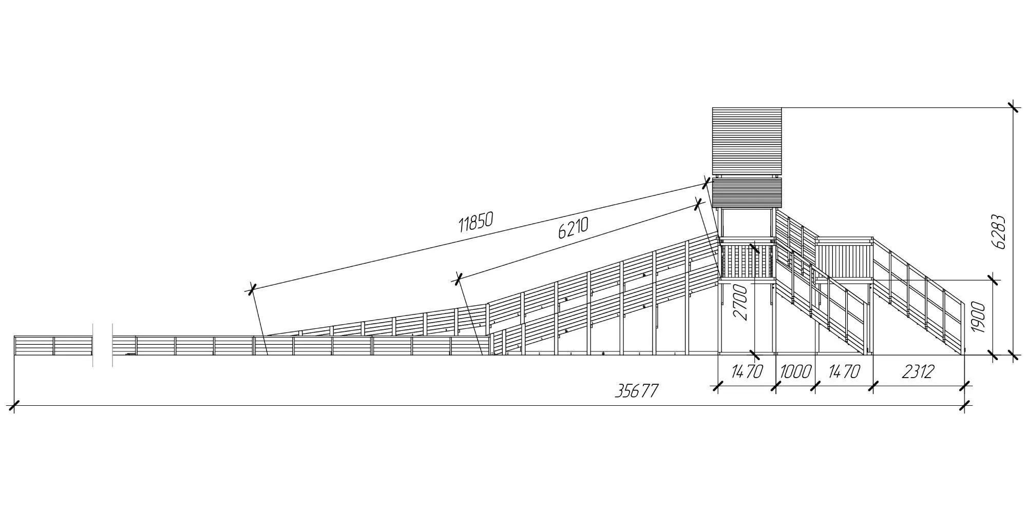 - Каркас - клееный брус 90х90 мм (башня и несущие конструкции), брус 45х90 мм (скат горки)