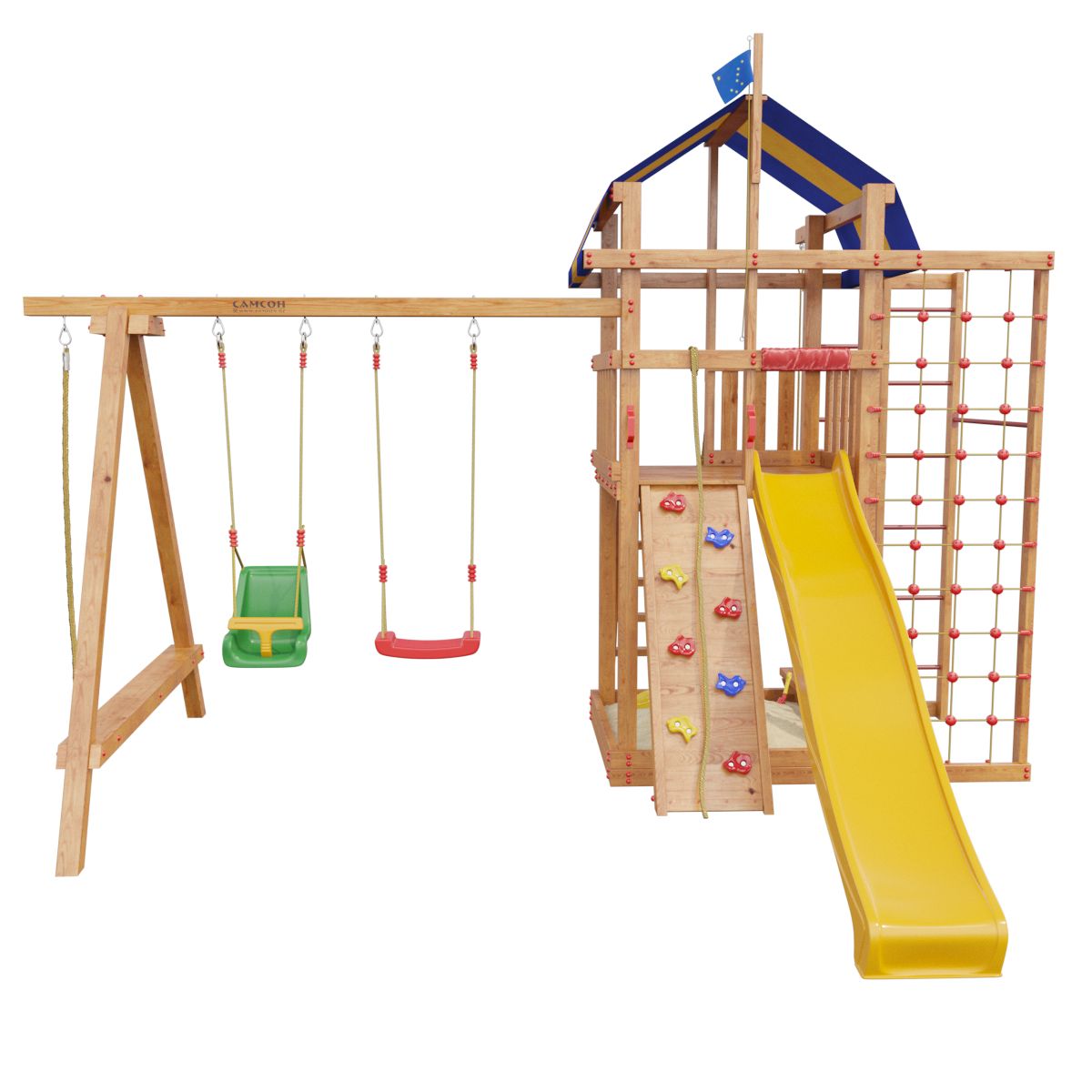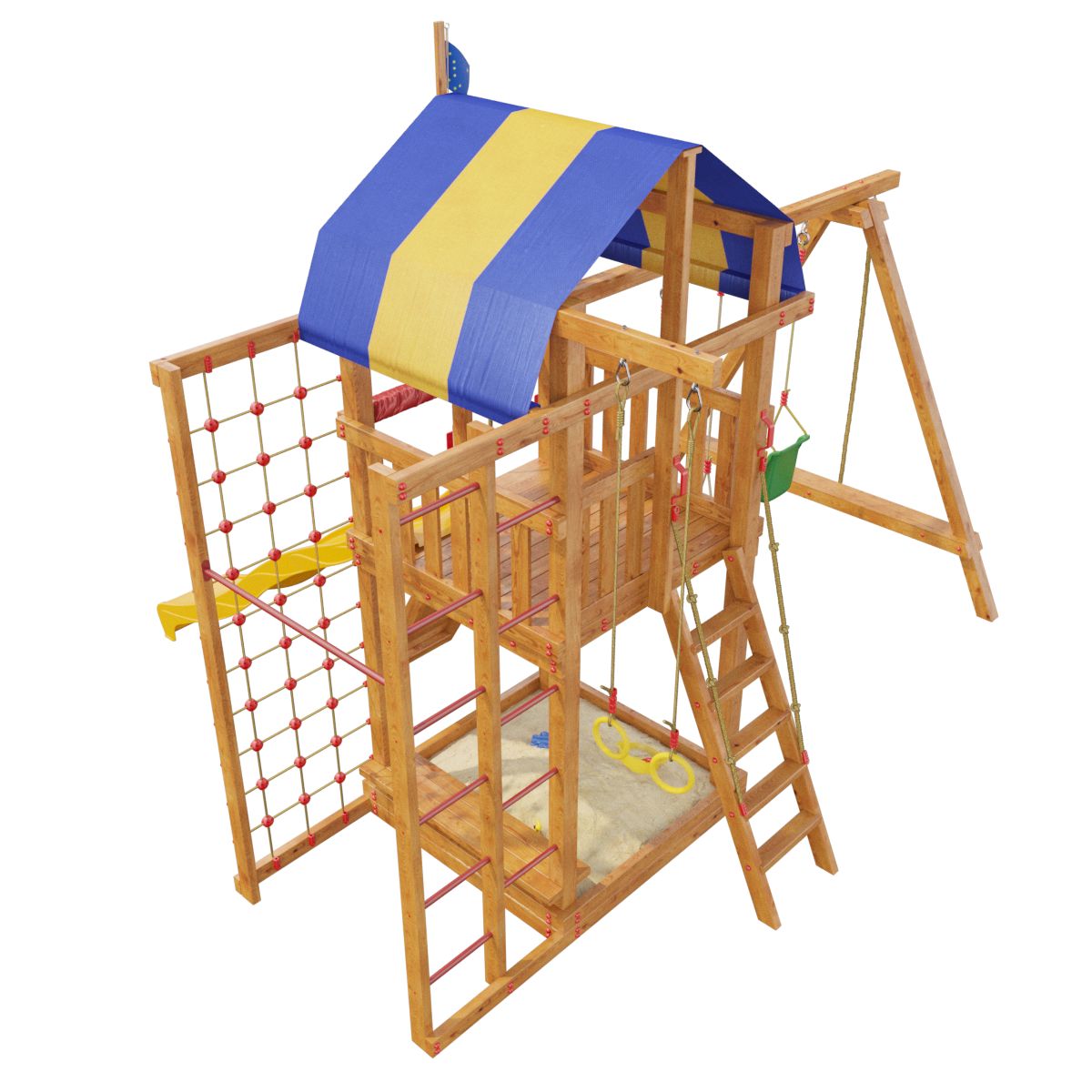 Товар поставляется в разобранном виде. В комплект для самостоятельной сборки входит подробная инструкция по сборке. Товар упакован в гофрокартонные короба в количестве: 10 мест + горка + качели со спинкой. Установка детской игровой площадки проводится на ровной поверхности, свободной от насаждений. Размер площадки не менее 5,8м х 7,1м. Рекомендуем зафиксировать конструкцию используя анкера любой формы.