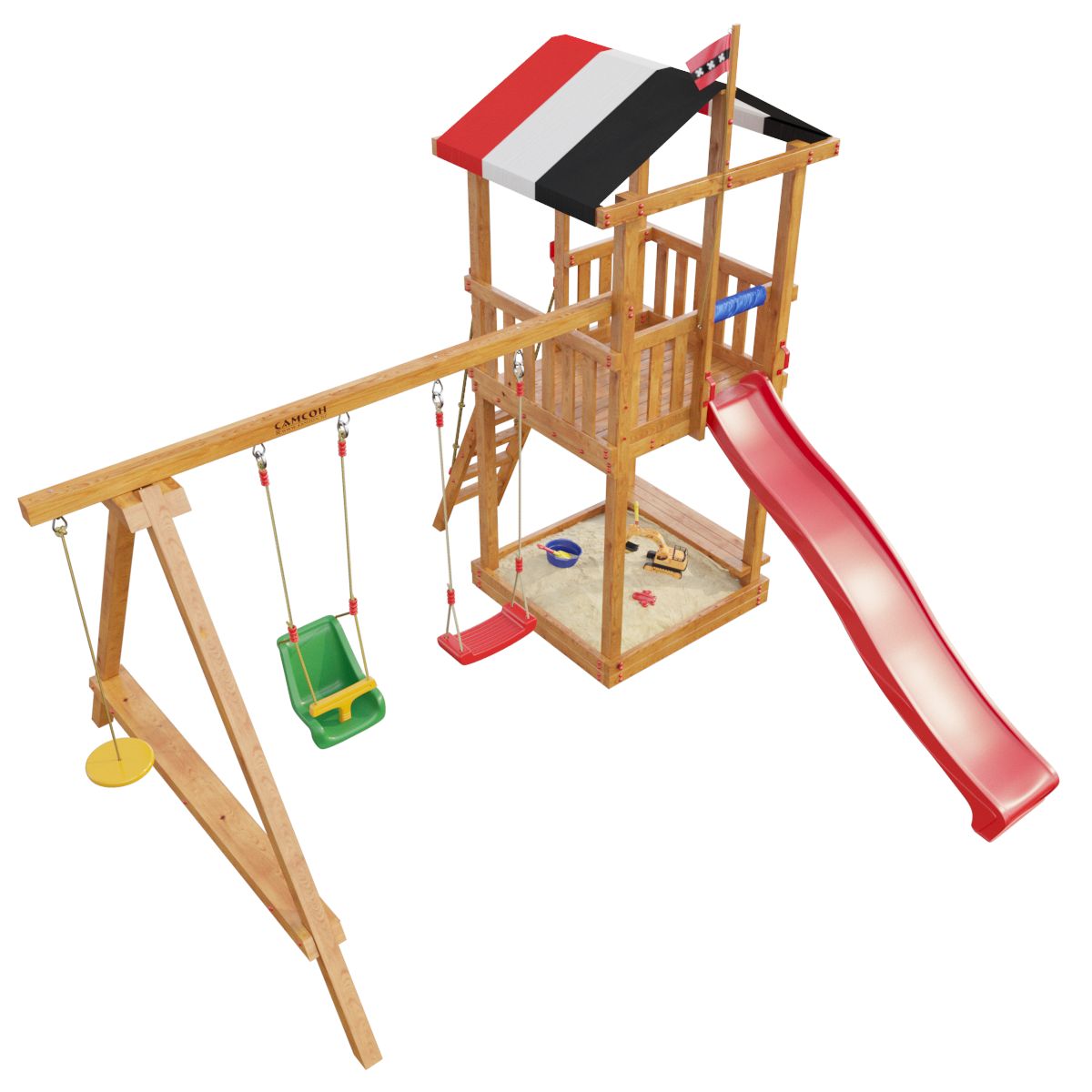 Товар поставляется в разобранном виде. В комплект для самостоятельной сборки входит подробная инструкция по сборке товара. Товар упакован в гофрокартонные короба в количестве: 9 мест + горка + качели со спинкой. Установка детской игровой площадки проводится на ровной поверхности, свободной от насаждений. Размер площадки не менее 5,8м х 7,1м. Рекомендуем зафиксировать конструкцию используя анкера любой формы.